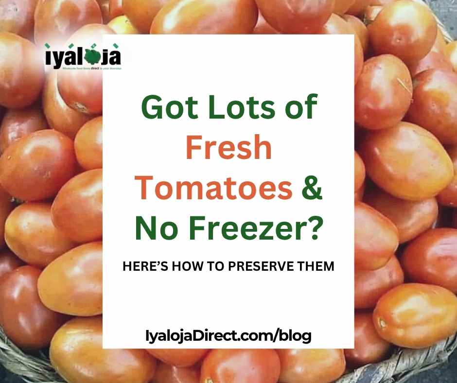 Tomatoes are one ingredient almost every Nigerian kitchen can’t do without. From stew to jollof rice, soups, sauces, and even as base for small chops dips; tomatoes are always in demand. But here’s the problem: Fresh tomatoes are highly perishable. With power supply being unreliable, not everyone has the luxury of keeping everything in a freezer. But no worries… you can still preserve your fresh tomatoes for weeks or even months without a freezer. Let’s show you how. Read More: How To Store Food During Rainy Season To Avoid Spoilage And Mold 1. Sun-Drying Method This is the traditional and most popular way to preserve tomatoes without electricity. All you have to do is: After a few days, they will shrink and dry completely. Sun-dried tomatoes can last for months. You can blend into powder or soak in water before cooking. 2. Blanching And Bottling If you like ready-to-use tomato puree, this method is for you. Simply: You have made for yourself a tomato paste that stays fresh for weeks without refrigeration. 3. Salt Water Preservation Salt is a natural preservative that helps slow down spoilage. To preserve using this method, You just process tasty tomato paste that would remain fresh-tasting and ready for your cooking at all times. 4. Airtight Container Storage Sometimes, keeping it simple works best. Just: These methods also help keep tomatoes longer than when left open in baskets. 5. Using A Food Dehydrator If you own a food dehydrator, this is the fastest and cleanest way. When you buy your tomatoes, just: Just like in the sun-dry method, blend into powder and store. Mix the flour with water when you want to use it. Buying tomatoes in bulk is a smart move when the price is low, but proper storage is what truly saves you from wasting money. So, How Much Is A Basket Of Tomatoes In Lagos Today? The price of a basket of tomatoes depends on so many factors, including the size of the basket, the season, and even the type of tomatoes. However, the good thing is that when you buy your tomatoes from Iyaloja Direct, you get your fresh tomatoes at wholesale prices whether in portions, or baskets directly from Mile 12 market. That’s right! No matter how small your order is, with Iyaloja Direct, you enjoy wholesale prices on your foodstuffs and groceries in Lagos, because we are buying for so many people at once with our weekly foodstuff sharing. Join our foodstuff sharing groups today or order directly on our website Iyaloja Direct and save up to 40% on food budget while enjoying doorstep delivery anywhere in Lagos.